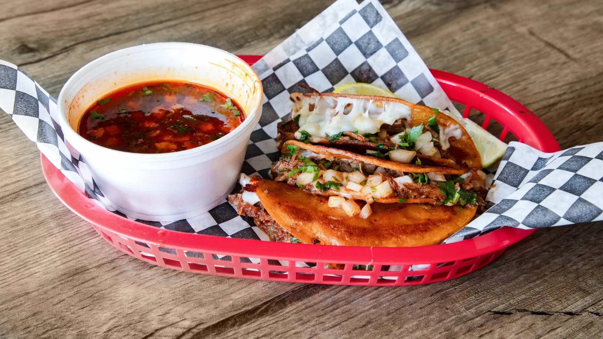 Succulent Birria Beef And Melted Cheese In Crispy Tortillas, Paired With Rich Consomme And Lime Wedges.